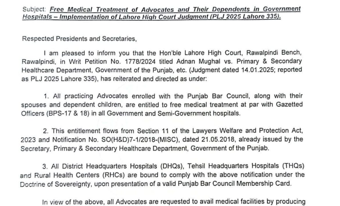 Justice Jawad Hassan has ruled in the case of Adnan Mughal Advocate vs. Federation of Pakistan that lawyers are equivalent to gazetted officers. All government institutions, especially the Health Department, are directed to provide lawyers with the same medical facilities in public hospitals as those available to gazetted officers. This decision ensures equal and quality healthcare for lawyers, recognizing their vital role in justice delivery and constitutional integrity.